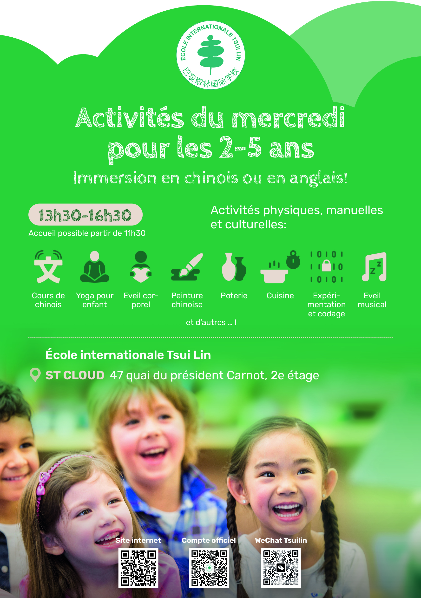 Elles sont ouvertes à tous les enfants âgés de 2 à 6 ans et permettent l’immersion linguistique en chinois ou en anglais dans des disciplines artistiques, manuelles et sportives. Les activités sont les mêmes dans chaque langue et sont assurées par un enseignant natif expérimenté.