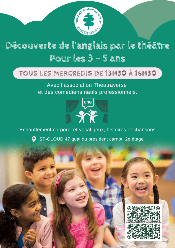 L’école internationale Tsui Lin collabore avec l’association Theatraverse et des comédiens natifs professionnels. Tous les mercredis de 13h30 à 16h30, plongez vos enfants dans des activités théâtrales en anglais !
