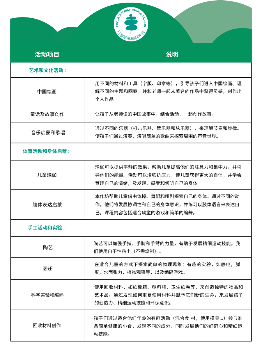 涵盖艺术、手工和体育等多个领域。 旨在启蒙孩子们的多语言智慧和身心全面发展。